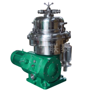電機(jī)通過螺旋齒輪副驅(qū)動(dòng)轉(zhuǎn)鼓繞主軸軸線做高速旋轉(zhuǎn),在轉(zhuǎn)鼓內(nèi)形成強(qiáng)大的離心力場。物料由上部中心進(jìn)料管流入轉(zhuǎn)鼓底部,通過碟片分流孔趨向轉(zhuǎn)鼓壁空間。在離心力作用下,液相沿碟片內(nèi)錐面趨向轉(zhuǎn)鼓壁流動(dòng)至上部的出液口排出。比液相重的固相物沉積向轉(zhuǎn)鼓內(nèi)壁形成沉渣,由排渣裝置自動(dòng)排出機(jī)外或停機(jī)后由人工清除。