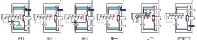 電機帶動皮帶輪驅(qū)動轉(zhuǎn)鼓繞自身軸線高速回轉(zhuǎn),反沖管向虹吸室內(nèi)灌液排除虹吸管內(nèi)的空氣,物料在預(yù)先編制的程序控制下,通過進料系統(tǒng)進入高速旋轉(zhuǎn)的轉(zhuǎn)鼓內(nèi)。在離心力和虹吸抽離的雙重作用下,物料均布在過濾介質(zhì)上進行脫液分離,液相透過固相物料和濾網(wǎng)縫隙,經(jīng)過濾內(nèi)轉(zhuǎn)鼓壁孔和虹吸室的通孔進入虹吸室,再由虹吸管抽走排出機外,固相物料截留在過濾轉(zhuǎn)鼓內(nèi)形成濾餅。料層檢測裝置實時檢測物料的充填位置,當濾餅達到事先設(shè)定的位置時,自動關(guān)閉加料閥,停止進料,然后對濾餅進行洗滌、脫水,待達到要求后,離心機降到卸料速度,卸料閥打開,刮料器在液動控制下旋轉(zhuǎn)上升,將濾餅刮下掉進螺旋出料器,經(jīng)出料閥排出機外。